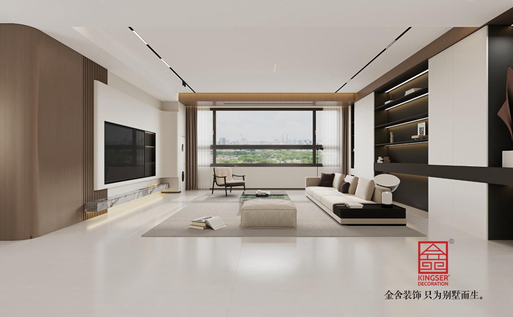 空間布局上,采用開放式設計,讓客廳與周邊區域自然銜接,增強了空間的通透感與互動性。大面積的落地窗是設計亮點,引入充足自然光線,同時將城市景觀納入室內,使空間與外界環境有機融合。